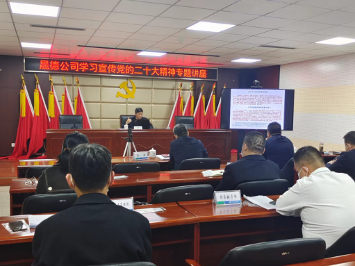 為深入學習宣傳貫徹黨的二十大精神,進一步引導黨員干部把握思想精髓、核心要義。11月23日,晟德公司開展黨的二十大專題輔導講座,邀請中共承德市委黨校校委委員兼教務處長、承德市社科委員會委員、市委宣講團成員王明香教授作輔導講課。晟德公司班子成員、全體黨員、入黨積極分子參加學習。王明香教授以《新時代新征程的政治宣言和行動綱領——黨的二十大精神解讀》為題,對黨的二十大報告進行了深入淺出地講解。深入解讀了黨