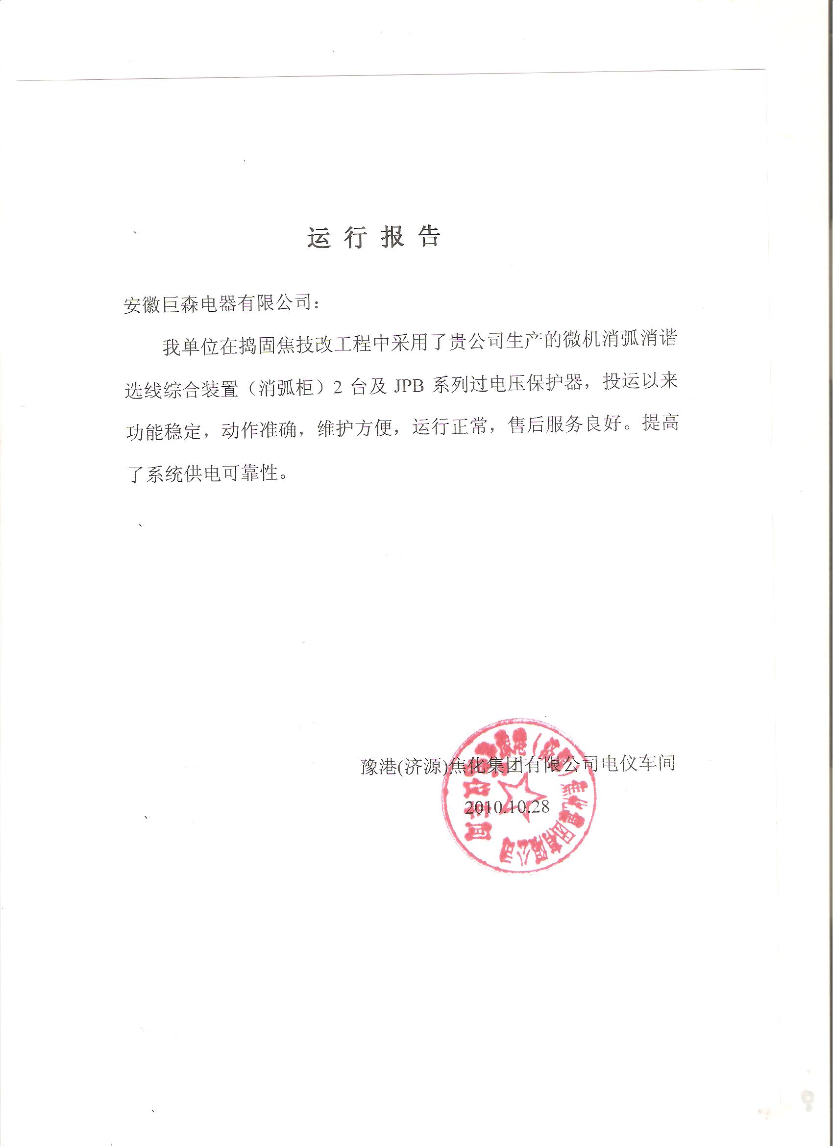 豫港濟源焦化關(guān)于微機消弧消諧選線綜合裝置以及JPB系列過電壓保護器的運行報告