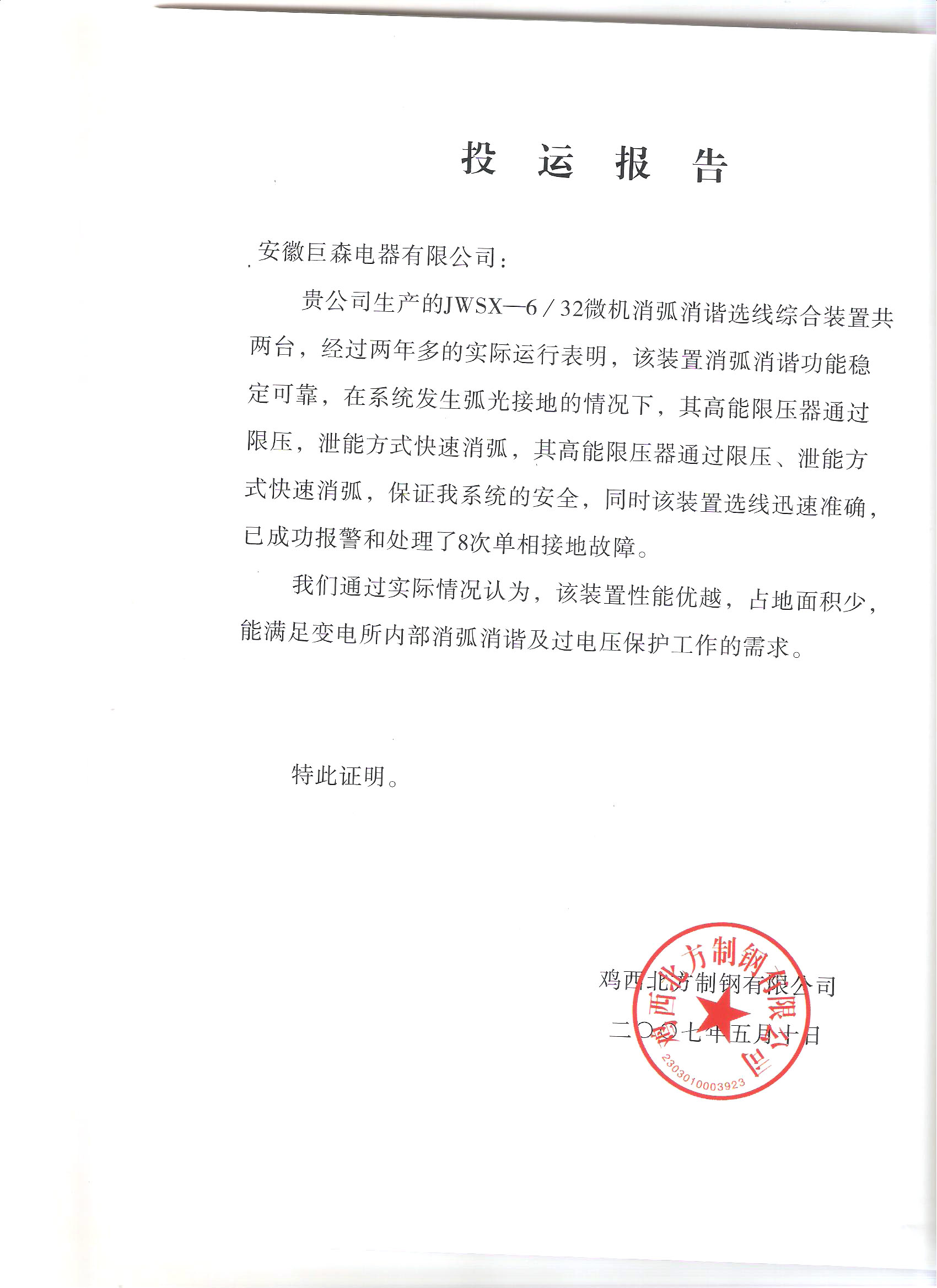 雞西北方制鋼關(guān)于JWSX-6/32微機(jī)消弧消諧選線綜合裝置的運(yùn)行報(bào)告