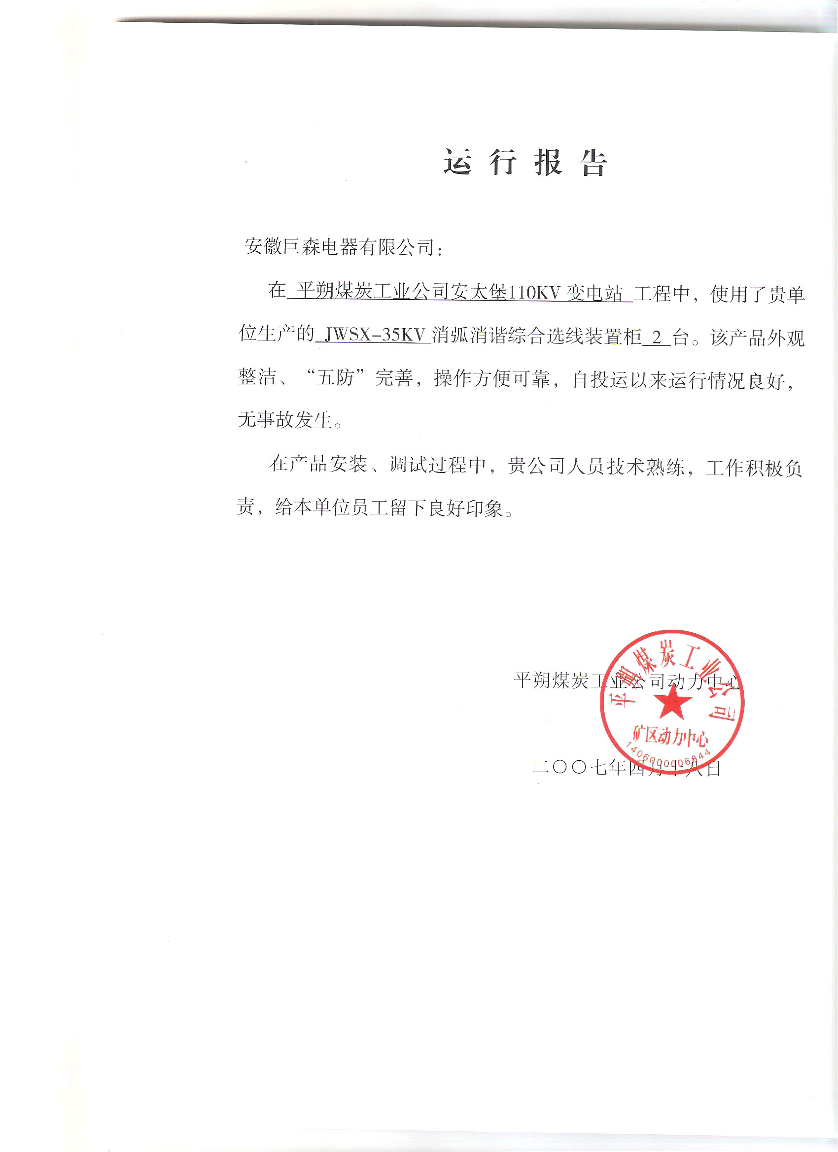 平朔煤炭工業關于JWSX-35KV消弧消諧綜合選線裝置柜的運行報告