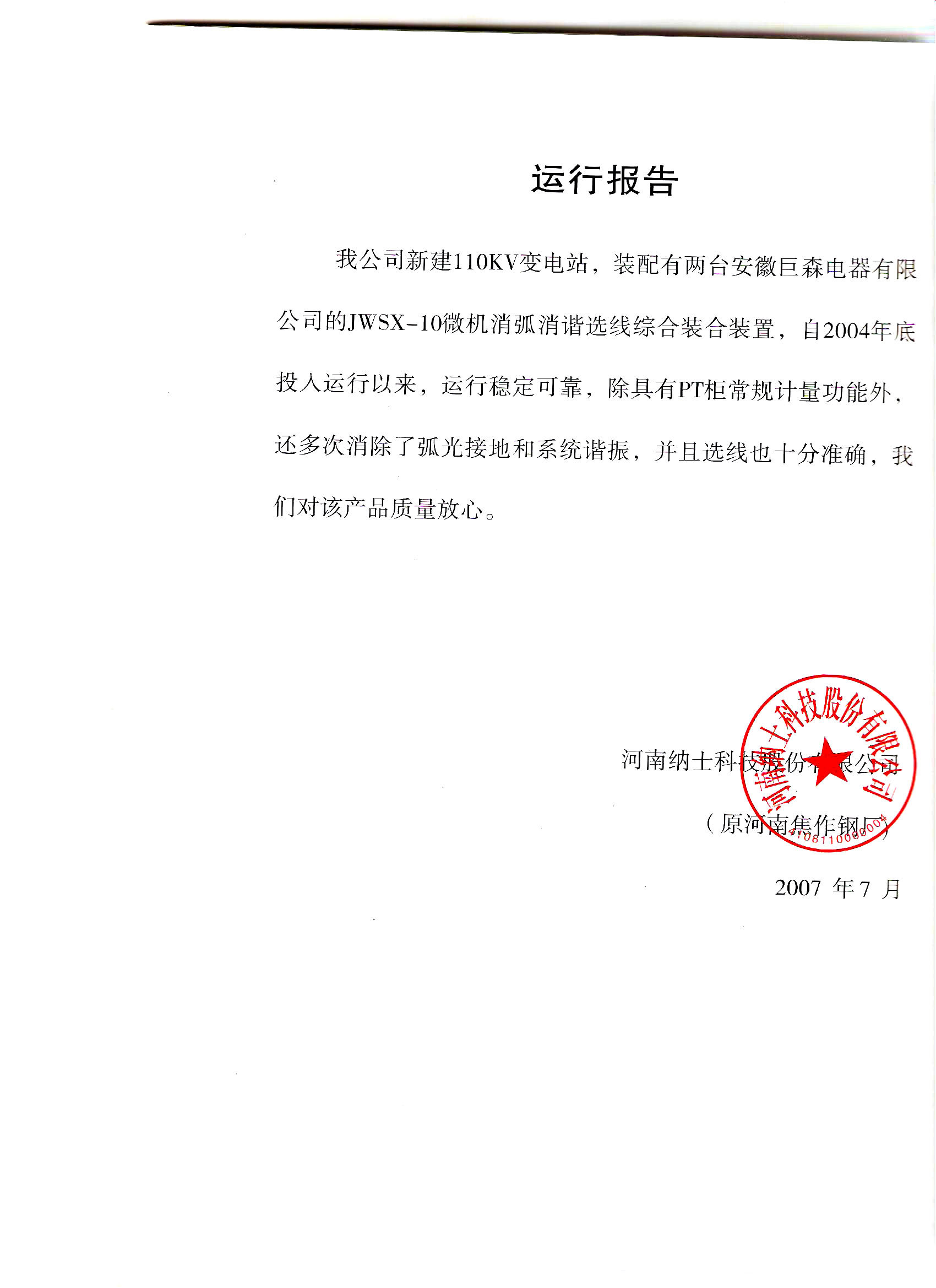 河南納士科技關于JWSX-10微機消弧消諧選線綜合裝置的運行報告